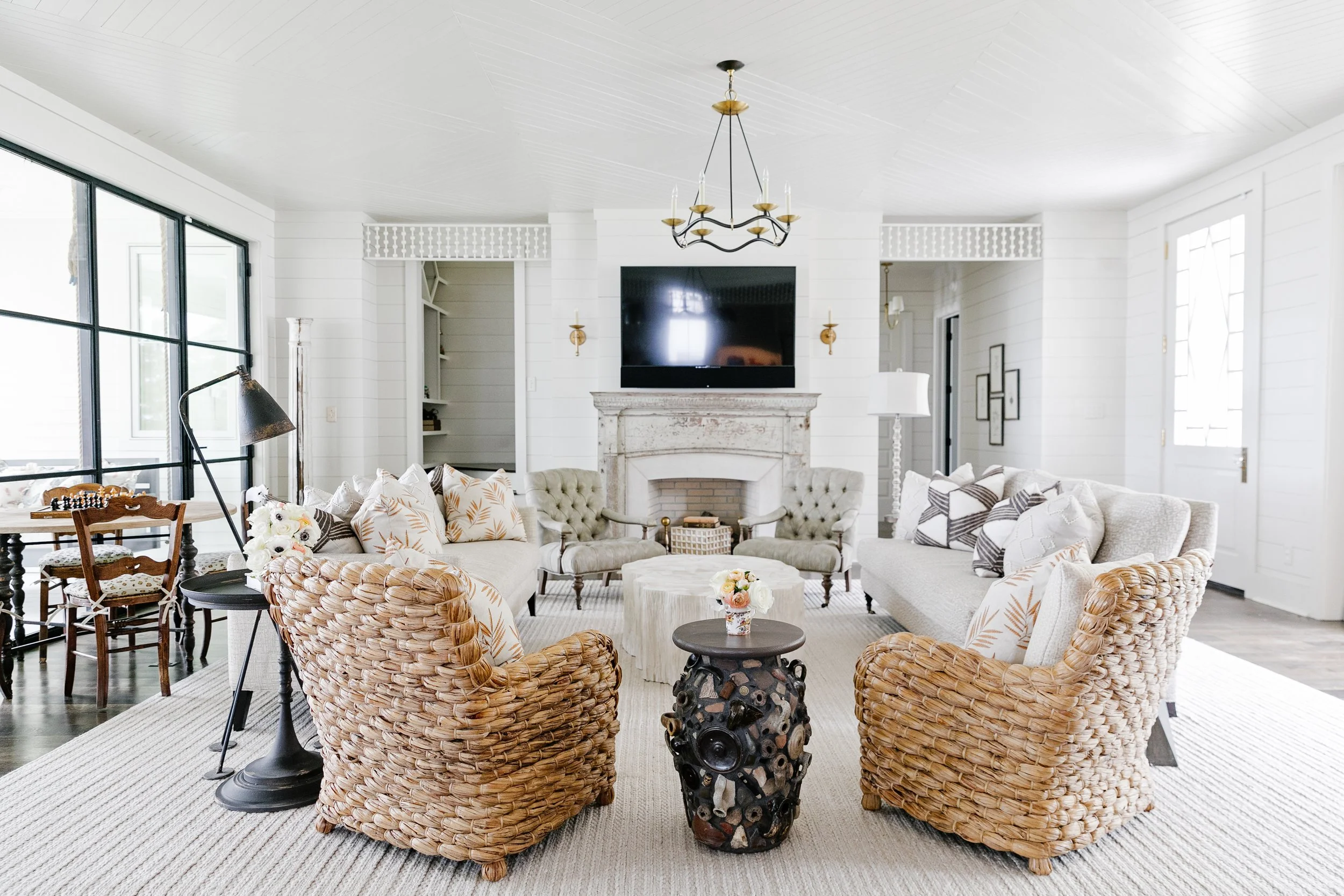 As inviting as the house is, the main attraction at a lake house is, of course, the lake. This home was designed to take full advantage of its shoreside setting. A classic screen porch stretches almost the full length of the house in the back, facing Horseshoe Lake, and wraps around the side, affording panoramic views of the backyard, dock and lake. Anchored by a hexagonal, gazebo-style conversation and tv area in the corner, the porch also includes a large built-in grill and a slew of farmhouse-back-porch essentials: wicker rocking chairs, a porch swing, and a screen door.