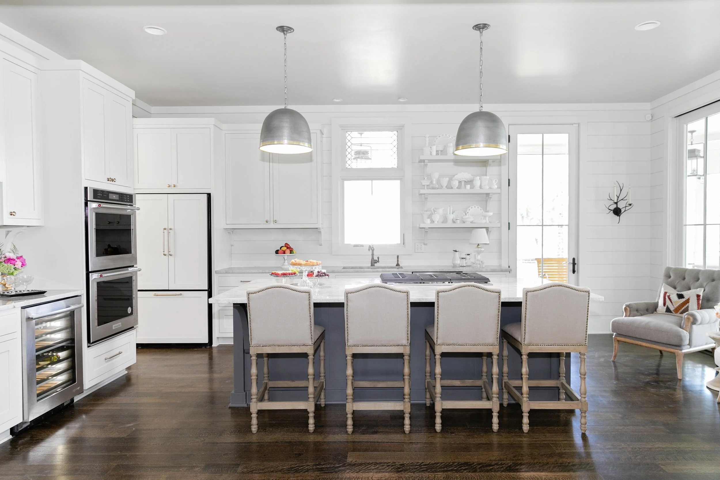 The couple wanted their lake house kitchen to mimic the layout of the one in their Memphis home, but its aesthetic had to blend the eclectic style of retro-meets-today. Estes achieved that goal by adding corbels to the wall cabinets and the island and lining the walls with white shiplap. An antique leaded-glass window found by the client looks right at home over the sink. Light gray quartz countertops and traditional fixtures keep the look timeless, while a trio of wall shelves hold the owner’s collection of vintage milk glass. Says Estes of the vignette, “Those are all [the owner’s] pieces that she’s collected and bought. I think the collection says a lot about her—elegant, interesting, understated, lots of good taste.”